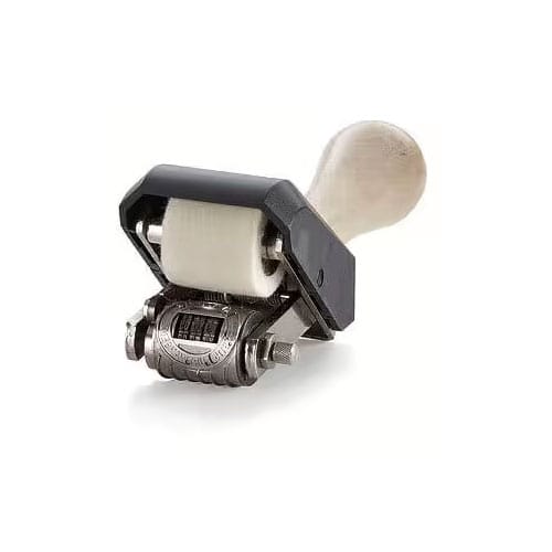 Poštni žig z valjčkom, model 130, združuje tiskanje datumov z okroglo površino za besedilo in valovitimi črtami. Ta presenetljivo priročen valjčni žig natančno tiska datum, besedilo in valovite črte.