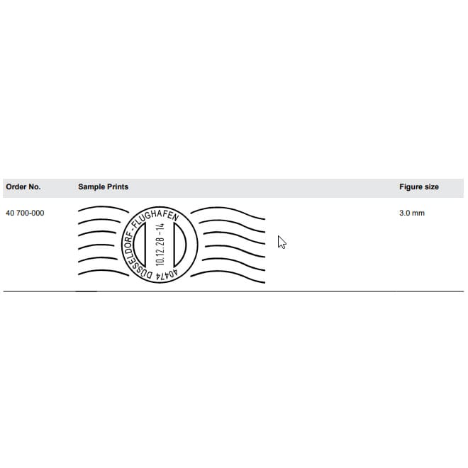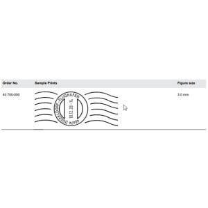 - Velikost površine za besedilo: Premer poštnega žiga 26 mm, največji premer odtisa 29 mm, brez gravure